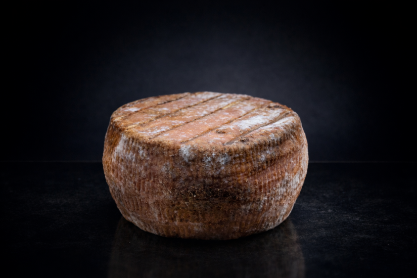 Ce fromage se présente sous la forme d’un petit tonneau d’environ un kilo, reconnaissable à sa croûte striée et parée d’un bel orange automnal. Sous cette écorce généreuse, la pâte d’un blanc ivoire, dense et marbrée, peut devenir légèrement cassante avec l’affinage.