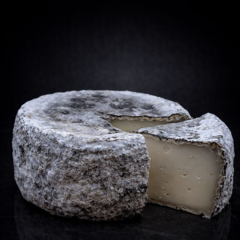 Petite tomette d’environ 600g, à la croûte cirronée et crevassée comme une authentique tomme de Savoie, qui arbore une belle teinte granitique. Sous cette écorce rustique, la pâte, d’un blanc ivoire avec de petites ouvertures, offre une texture fondante et généreuse. En bouche, elle révèle des arômes lactés et doux en jeunesse, évoluant vers des notes de noisette, de foin et une touche minérale après affinage.